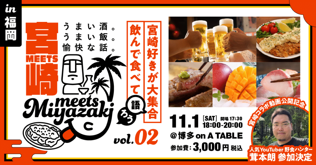 ★ピックアップイベント★【11/1(土)開催!】Meets宮崎 in福岡!人気YouTuber茸本朗さん来場!お土産付き✨