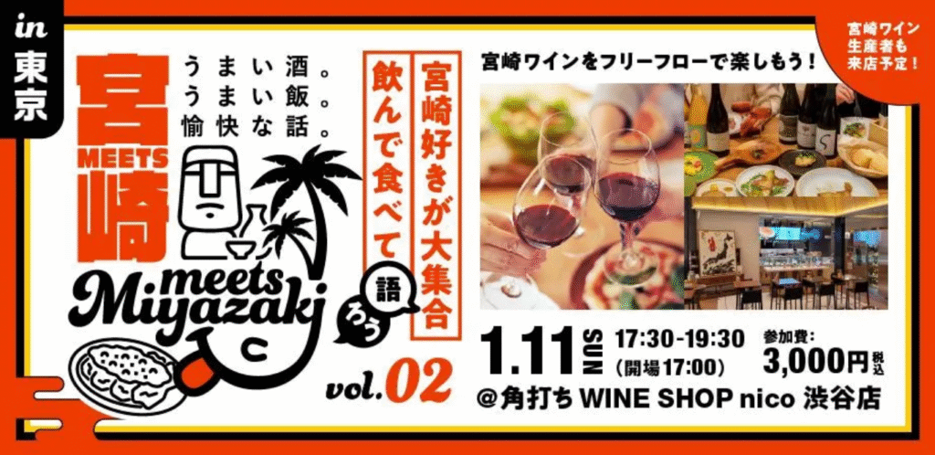 当日は、宮崎県産ワイン🍷のほか宮崎の本格焼酎、豪華ビュッフェをご用意して、皆様のご参加をお待ちしております!