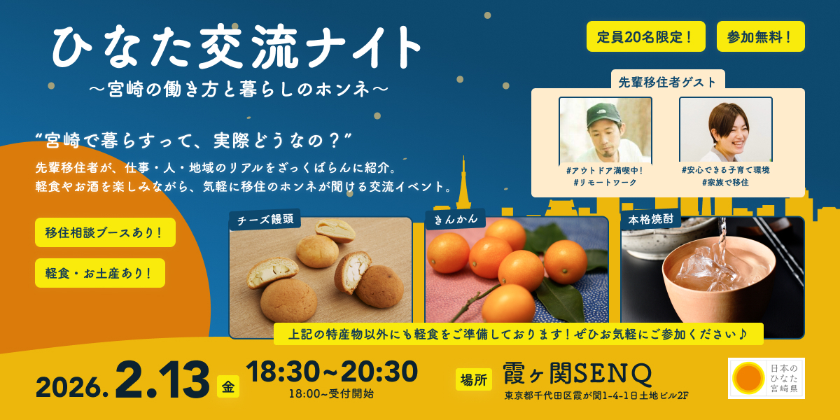 本イベントでは、実際に宮崎へ移住した先輩移住者をゲストに迎え、仕事のこと、暮らしのこと、人とのつながり、移住前の不安や決断のポイントなど、ここでしか聞けない“リアルな声”をざっくばらんにお話しいただきます。